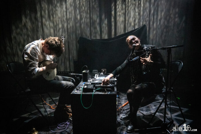 Contrairement à leurs habitudes, le duo ne joue pas masqué, mais ne va guère se dévoiler pour autant. Les deux musiciens dont on ne connait pas les noms, vont se livrer à un concert tout en intériorité, immergés dans leur musique d’un bout à l’autre du concert, ne nous laissant aucun temps de respiration. Banjo dissonant, jeu de guitare fiévreusement percussif, K7 passées à la moulinette d’effets, chant déchirant venu du fond des âges, leur univers (qu’il qualifie eux-mêmes de Slaker « paresseux » trad) oscille ce soir-là entre folk décharnée et noise vibrante avec une rare intensité. Comme sur leur surprenant et envoutant dernier album Remscéla (sorti en mai 2025 chez Broadside Hacks Recordings), le groupe puise dans la féconde mythologie du Táin Bó Cuailnge, foisonnante et ancestrale épopée celtique irlandaise, pour nous conter les exploits sanglants du héros archétypal Cuchulain mais aussi les destins tragiques des personnages féminins de la saga. Sur scène, le duo dépouille encore plus sa musique, se débarrassant même des quelques rythmiques dub du disque pour aller à l’os, vers l’émotion brute. Cette expérience dont on sort aussi secoué que ravi, nous aura fasciné d’un bout à l’autre, tout comme une bonne partie de l’audience du club.